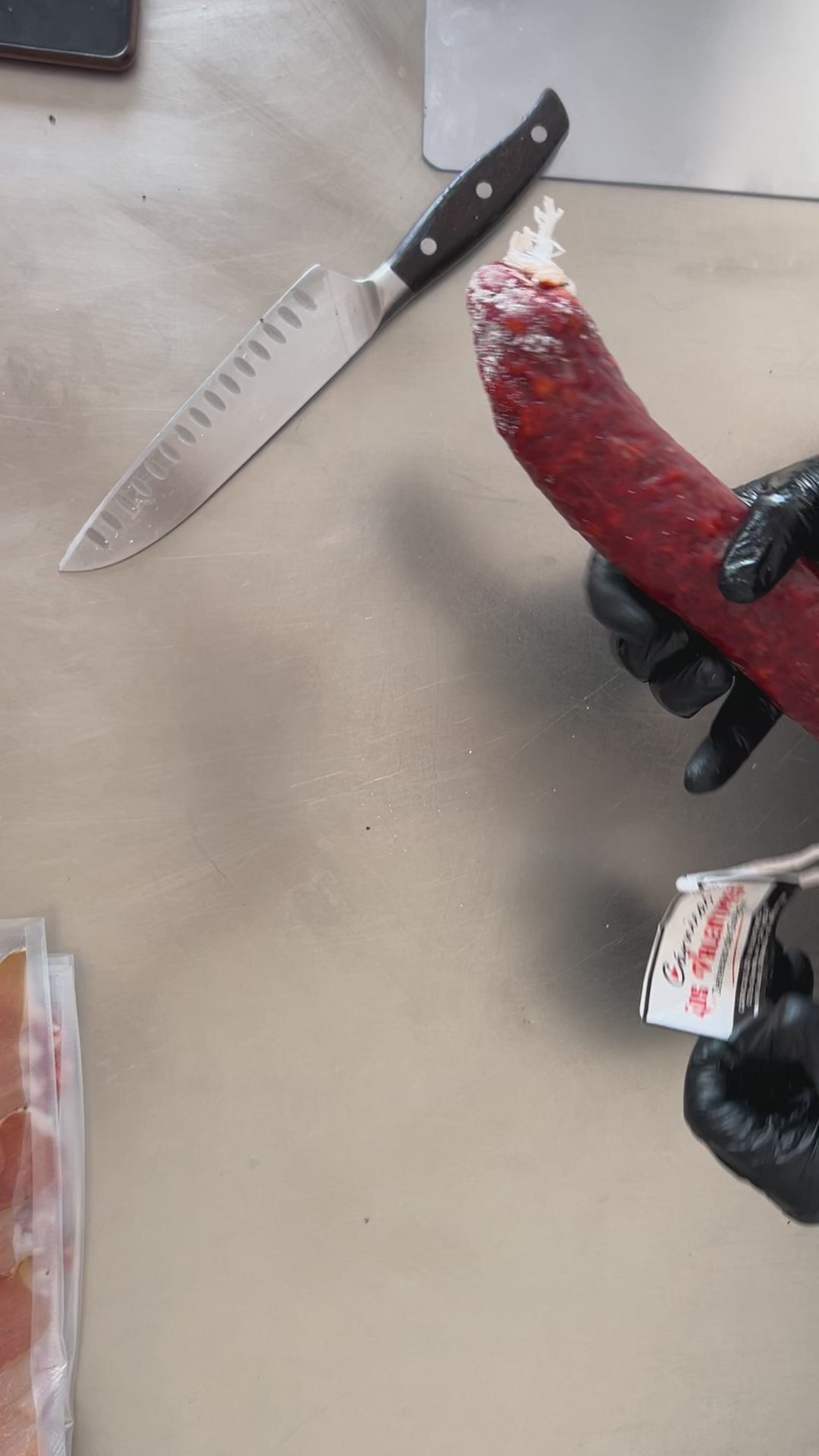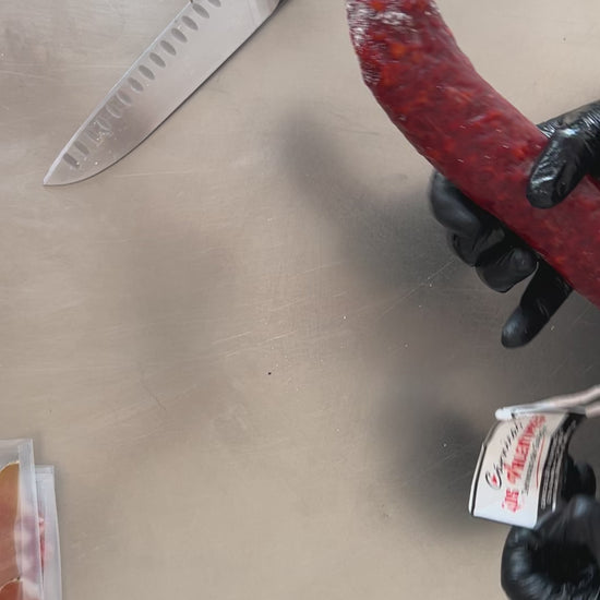 Sweet country chorizo is a traditional cured sausage made with pork and spices. It is characterized by its sweet flavor and its ready-to-eat candle-shaped presentation. It stands out from other chorizos due to its texture, aroma, and unique combination of spices, making it a popular choice for appetizers or as a side dish. Price based on final weight. Tell us how much you want and we'll prepare it. Payment is made in store. Price per kilo: 13.60.